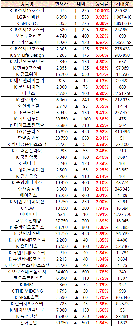 시간외 단일가매매 종가 종목 확인시 단순 급등주 등락률만 볼 것이 아니라, '거래량'에 따르는 거래대금도 판단하면서 보는 것이 중요합니다.