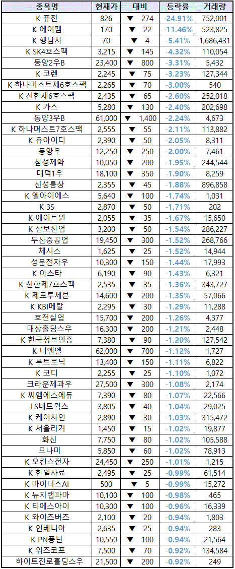 (종목명 앞에 'K'는 코스닥 종목을 의미합니다.)