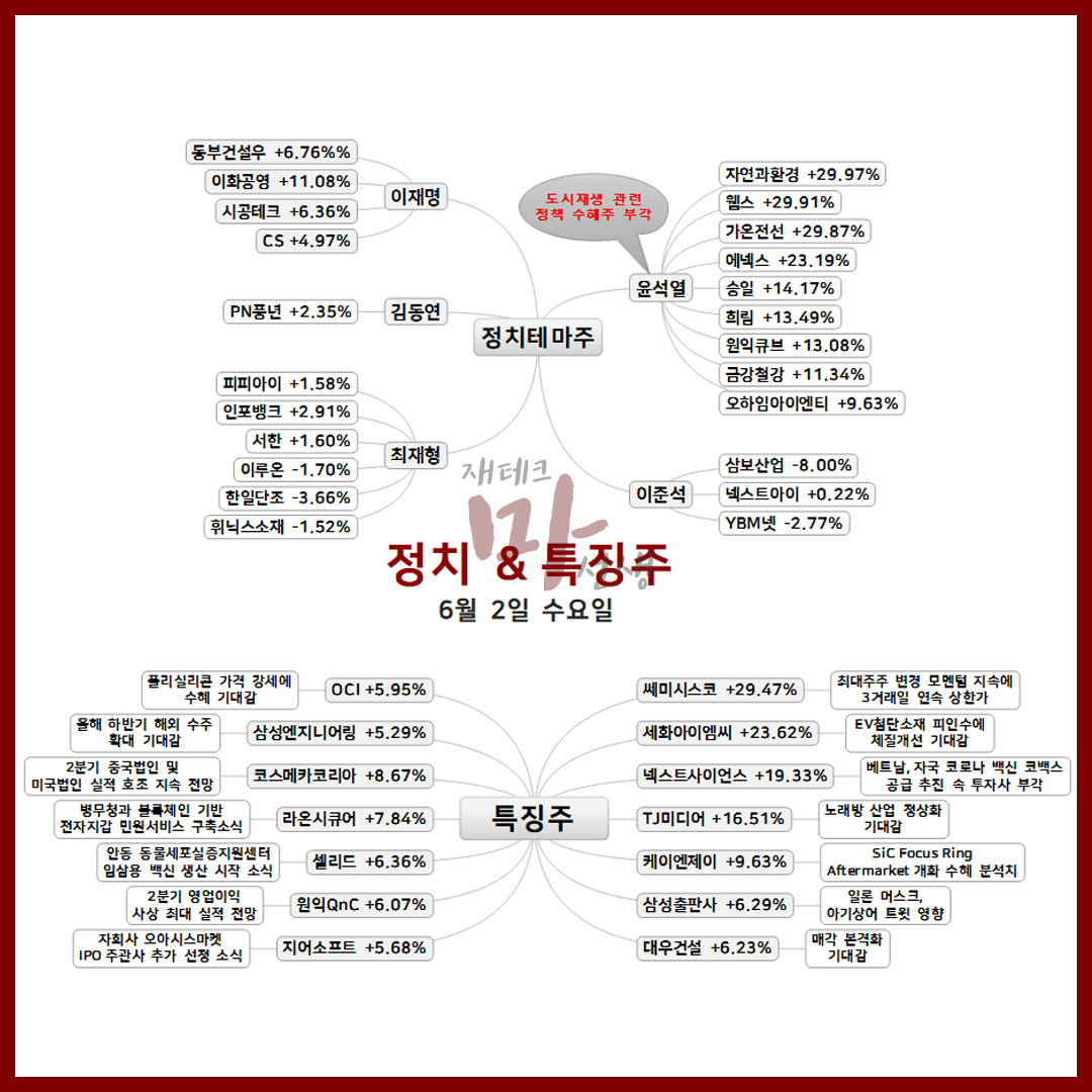 6/2 특징주 테마주 윤석열정책주 건설주 원자력발전 전선주 지하도로 관련주