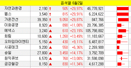 6월 2일 오늘의 상한가 종목 및 이유 :: 가온전선 자연과환경 웹스 주가 외