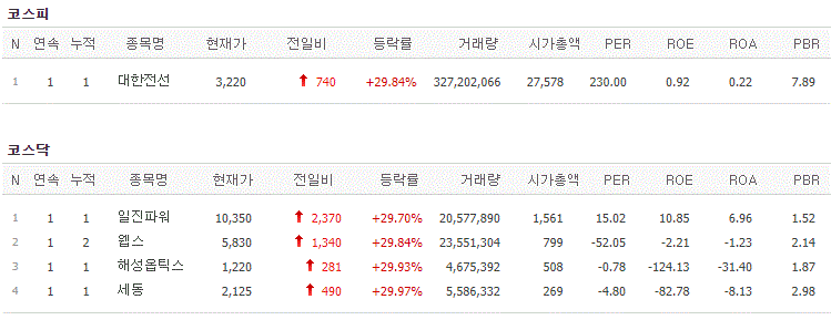 코스피에서는 대한전선이 상한가를 기록했고, 코스닥에서는 일진파워, 웹스, 해성옵틱스, 세동이 상한가를 기록했습니다.