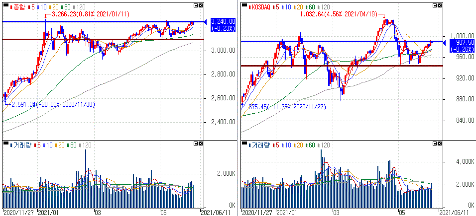 금일 코스피 지수는 -0.23% 하락한 3,240.08에 마감하였고, 코스닥 지수는 -0.26% 하락한 987.58에 마감하였습니다. 미국발 긴축의 영향에 국내증시는 저항구간에서 조정을 보이는 모습을 보였습니다.