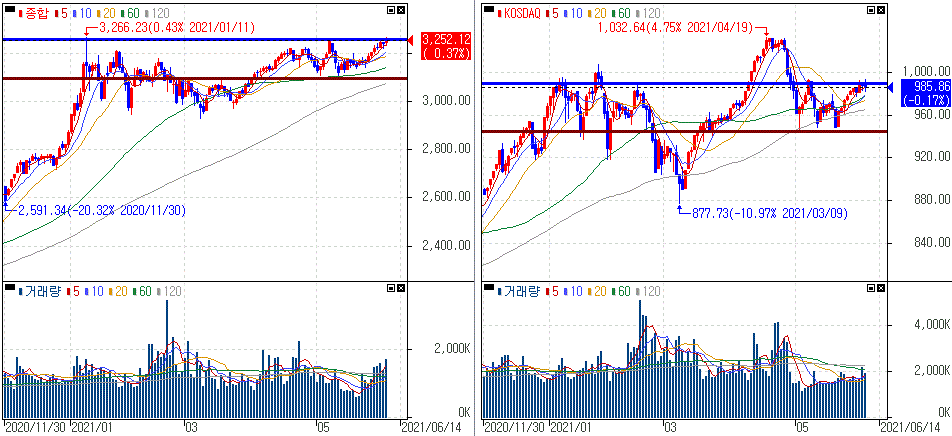 금일 코스피 지수는 +0.37% 상승한 3,252.12에 마감하였고, 코스닥 지수는 -0.17% 하락한 985.86에 마감하였습니다. 사상 최고치를 기록하고 있는 코스피이지만 여전히 지수저항구간 오차범위내 흐름을 보여주고 있습니다.