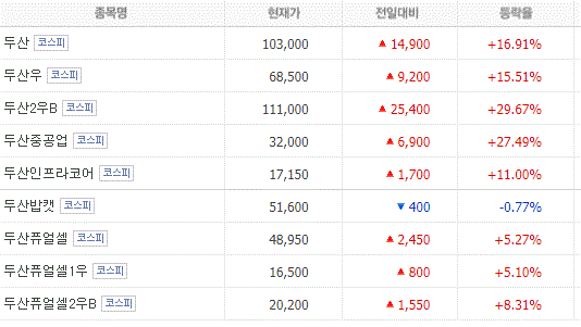 두산중공업이 국내 최대 제주해상풍력단지 기자재 공급 소식에 원자력발전소 테마주 강세 소식까지 이어지면서 전반적인 두산그룹주 종목들이 부각을 보여준 모습입니다.