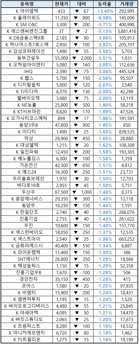 (종목명 앞에 'K'는 코스닥 종목을 의미합니다.)