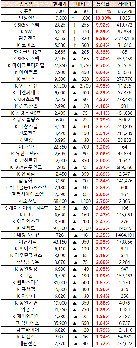 시간외 단일가매매 종가 종목 확인시 단순 급등주 등락률만 볼 것이 아니라, '거래량'에 따르는 거래대금도 판단하면서 보는 것이 중요합니다.