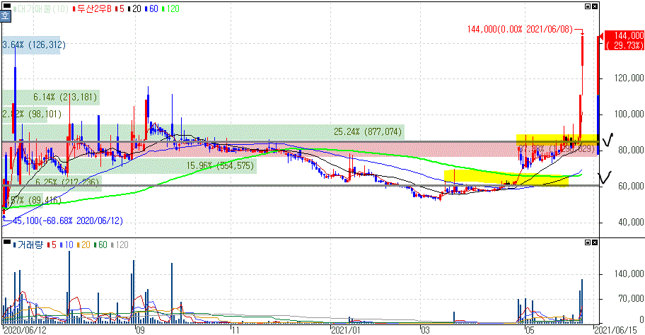 두산의 재무구조 개선 기대감 및 올해 실적 턴어라운드 가속화 전망 등에 연속 상한가를 기록한 두산2우B 주가 입니다.