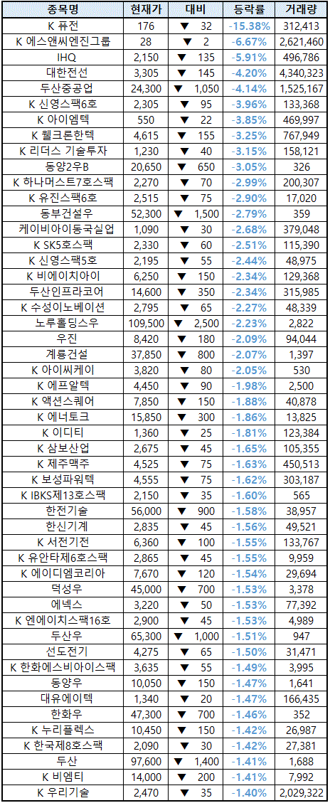 두산그룹주 하락 및 원전 테마 하락으로 정규장 -20.78%