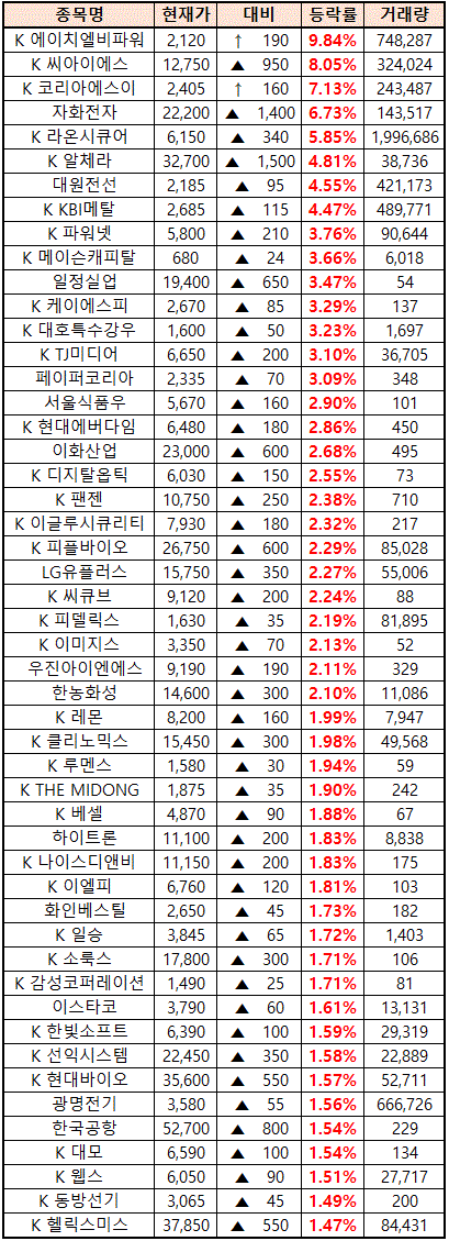 (종목명 앞에 'K'는 코스닥 종목을 의미합니다.)