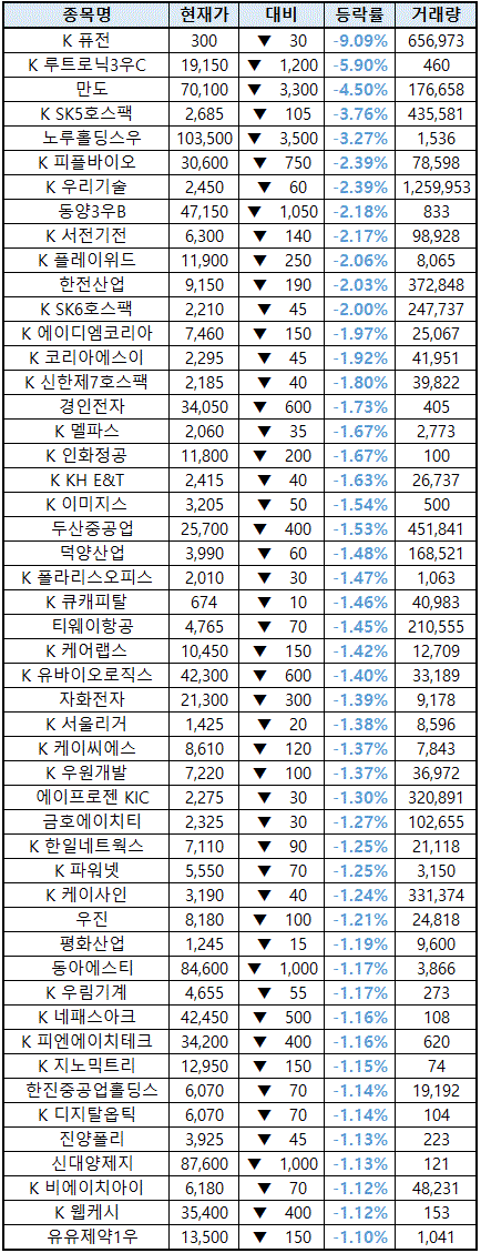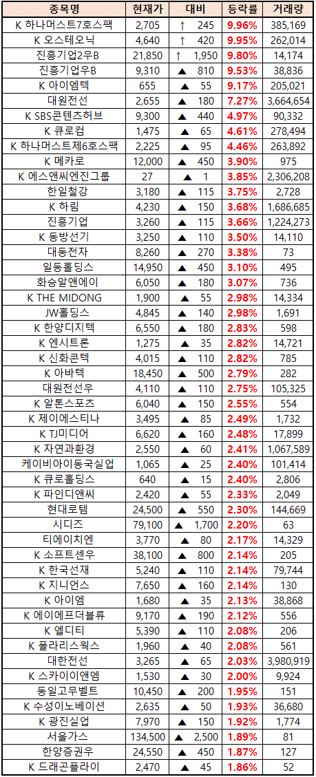 (종목명 앞에 'K'는 코스닥 종목을 의미합니다.)