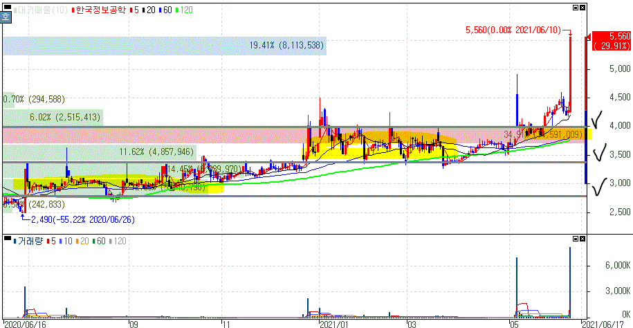 재료미노출 및 윤석열 테마주 편입설로 상한가를 기록한 한국정보공학 주가 입니다.