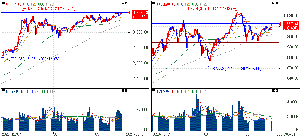 금일 코스피 지수는 +0.09% 상승한 3,252.13에 마감하였고, 코스닥 지수는 +0.63% 상승한 997.41에 마감하였습니다.