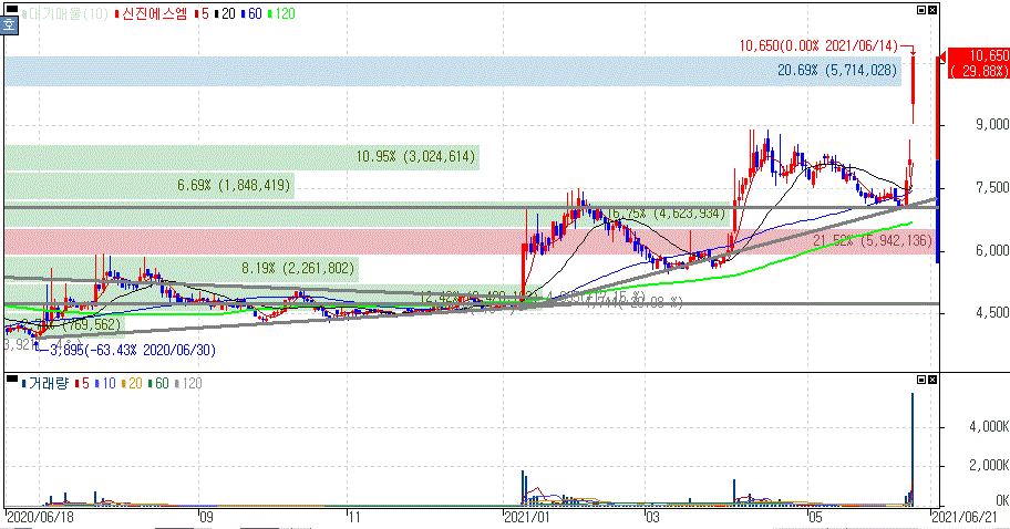 박용진 테마주로 부각을 받으면서 상한가를 기록한 신진에스엠 주가 입니다.