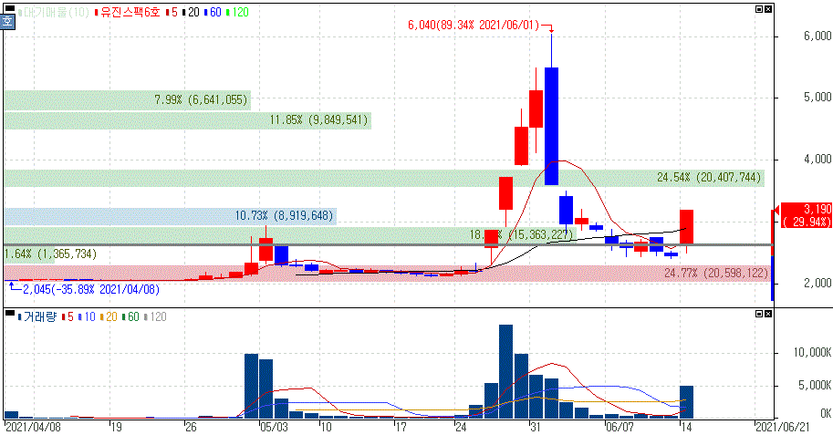 최근 기업인수목적회사 이상 급등으로 상한가를 기록한 유진스팩6호 주가 입니다.