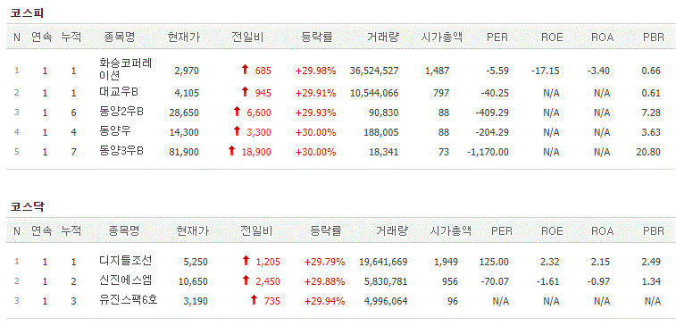 코스피에서는 화승코퍼레이션, 대교우B, 동양2우B, 동양우, 동양3우B가 상한가를 기록했고, 코스닥에서는 디지틀조선, 신진에스엠, 유진스팩6호가 상한가를 기록했습니다.