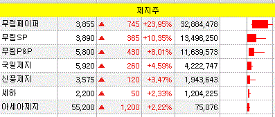 이에 무림페이퍼, 무림SP, 무림P&P 국일제지 등의 주가 부각을 보였으나 장막판에 주춤하는 모습을 보이며 마감하였습니다. 한창제지가 최근 정치테마주 성향을 가지고 있다는 점을 참고하시고, 제지주 전반적으로 검토를 해볼 수 있습니다.