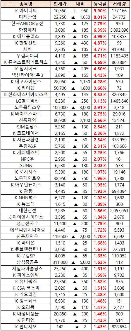 (종목명 앞에 'K'는 코스닥 종목을 의미합니다.)