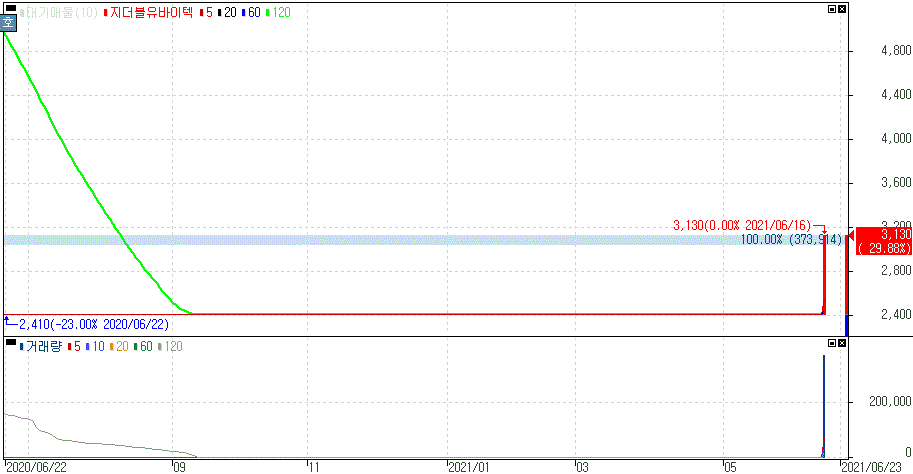 상장적격성 실질심사 대상 제외 결정으로 거래재개 첫날 상한가를 기록한 지더블유바이텍 주가 입니다.