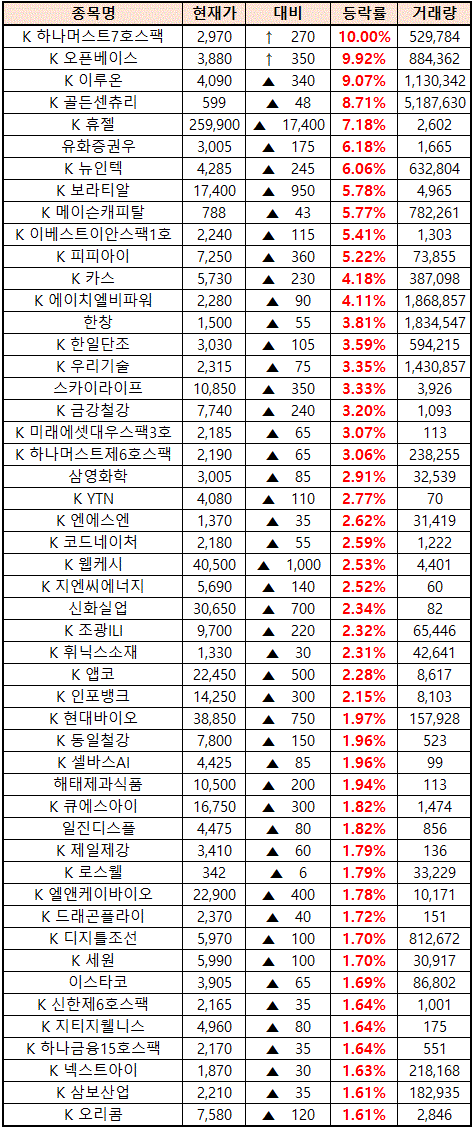 시간외 단일가매매 종가 종목 확인시 단순 급등주 등락률만 볼 것이 아니라, '거래량'에 따르는 거래대금도 판단하면서 보는 것이 중요합니다.