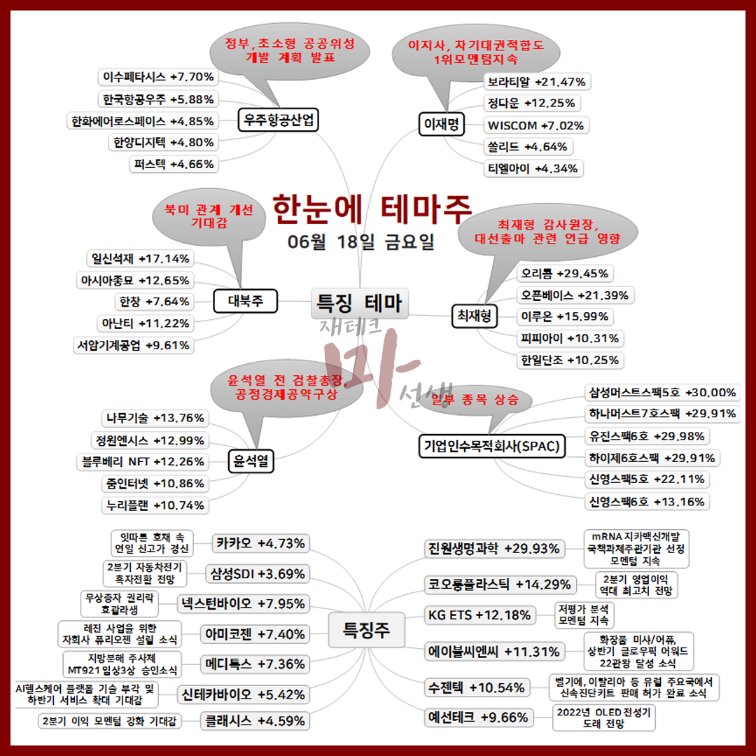6/18 한눈에 테마주 최재형 대북주 우주항공산업 통신장비 관련주