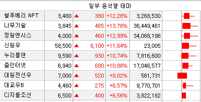 어제 공정경제공약 구상으로 시스템통합(SI) 관련주에 이어 공정경제공약 구상으로 포털시장 독과점 해소 수혜주로 줌인터넷, 삼성전자향 솔루션 공급 중소업체 나무기술, 그 외 블루베리NFT의 공상훈 사외이사 법대 동문으로 주가 부각을 받았습니다.