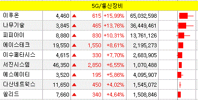 금일 상승을 보인 통신장비/5G 종목에 일부 정치 테마주를 포함한 다른 재료 영향을 받은 종목이 있으나 대체로 상승분위기가 연출되었습니다.