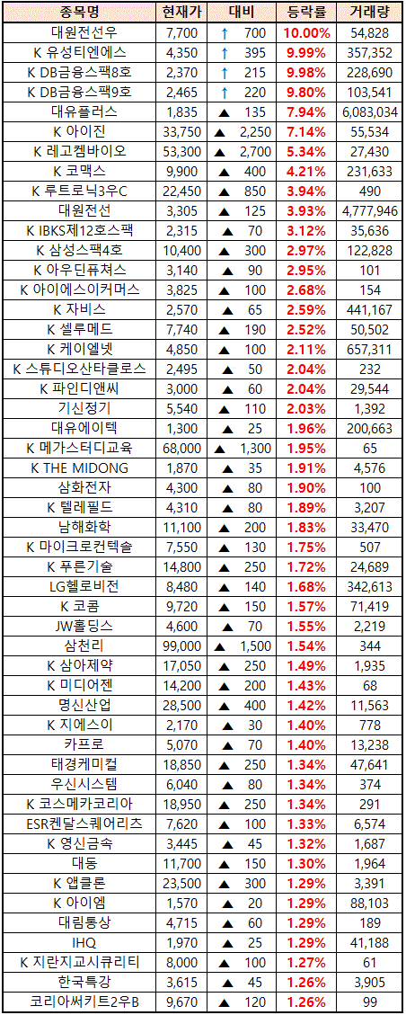 시간외 단일가매매 종가 종목 확인시 단순 급등주 등락률만 볼 것이 아니라, '거래량'에 따르는 거래대금도 판단하면서 보는 것이 중요합니다.
