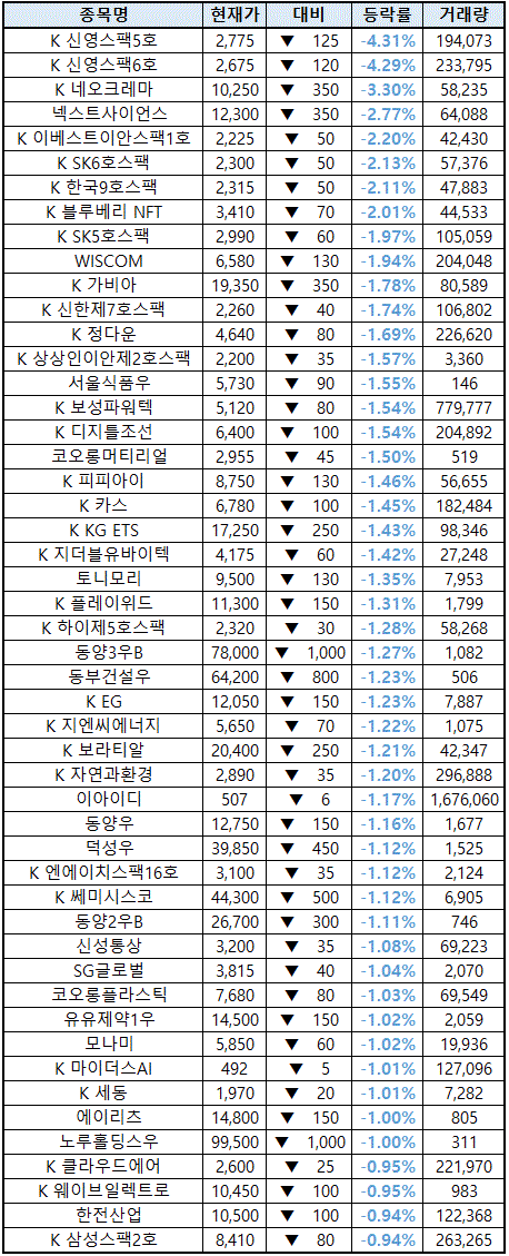 (종목명 앞에 'K'는 코스닥 종목을 의미합니다.)