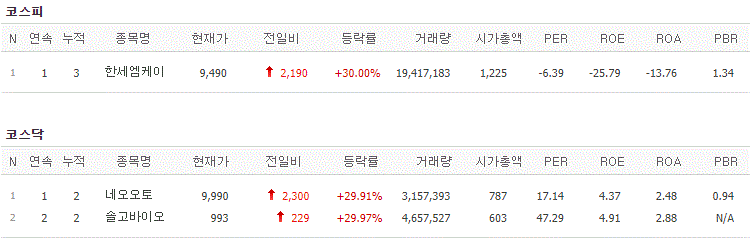 코스피에서는 한세엠케이가 상한가를 기록했고, 코스닥에서는 네오오토, 솔고바이오가 상한가를 기록했습니다.