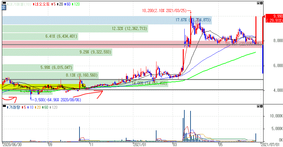 지난 3월 상승폭을 보인 이후 조정을 받더라도 7,000 후반대 가격을 유지해왔다는 것을 알 수 있습니다. 가장 유력의 정치인 테마주로 재료가 유지되고 있다보니 이탈하지 않았다는 것으로도 볼 수 있죠.
