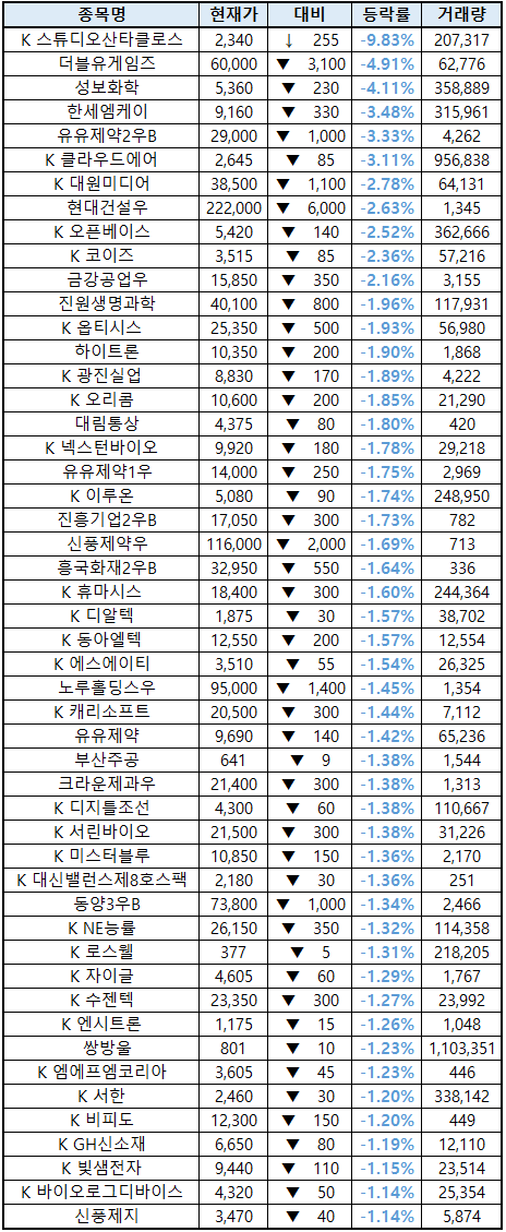 (종목명 앞에 'K'는 코스닥 종목을 의미합니다.)