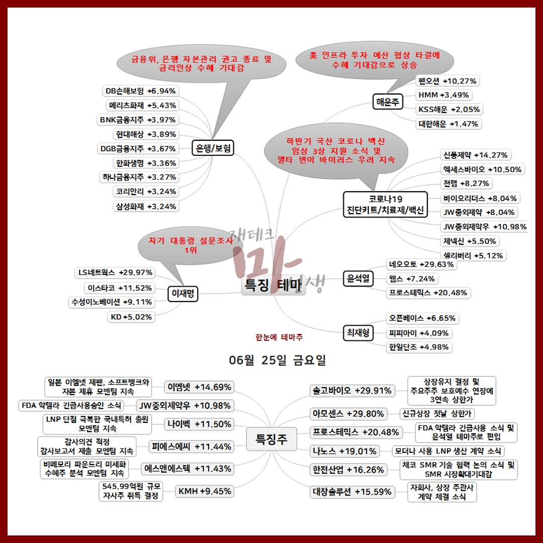6/25 한눈에 테마주 해운주 은행주/보험주 코로나19 치료제/백신/진단키트 관련주