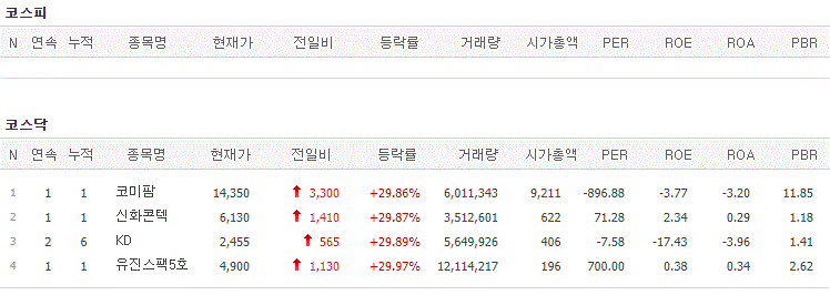 코스피에서는 상한가 종목이 없었고, 코스닥에서는 코미팜, 신화콘텍, KD, 유진스팩5호가 상한가를 기록했습니다.