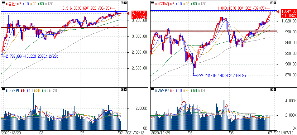 금일 코스피 지수는 +0.35% 상승한 3,293.21에 마감하였고, 코스닥 지수는 +0.88% 상승한 1,047.33에 마감하였습니다. 종종 미국발 테이퍼링에 대한 보도자료들은 나오고 있으나 그 시기를 앞당기진 않을 것이라는 쪽의 힘이 강한 분위기 입니다.