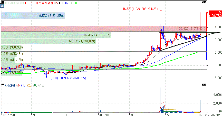 韓, 화이자/모더나와 백신 10억회분 국내 생산 협의 중 소식에 상한가를 기록한 코리아에셋투자증권 주가 입니다.