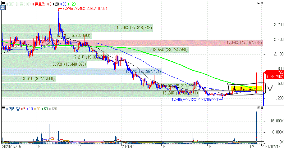 하지만 아래꼬리를 보여준만큼 단기적으로 방향 전환 가능성을 보여줄지 모르나 가장 영향으로 보여지고 있는 델타 변이가 주는 시장영향을 보면서 세밀한 전략이 필요한 시기입니다.