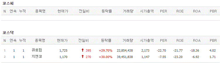 코스피에서는 상한가 종목이 없었고, 코스닥에서는 큐로컴, 지엔코가 상한가를 기록했습니다.