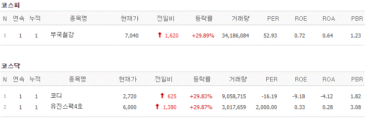 코스피에서는 부국철강이 상한가를 기록했고, 코스닥에서는 코디, 유진스팩4호가 상한가를 기록했습니다.