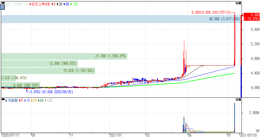 프로이천과의 합병 예비심사 통과 소식에 상한가를 기록한 유진스팩4호 주가 입니다.