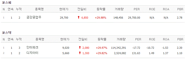 코스피에서는 금강공업우가 상한가를 기록했고, 코스닥에서는 인터파크, 디지아이가 상한가를 기록했습니다.