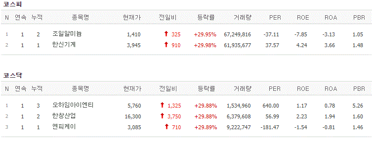 코스피에서는 조일알미늄, 한신기계가 상한가를 기록했고, 코스닥에서는 오하임아이엔티, 엔피케이가 상한가를 기록했습니다.