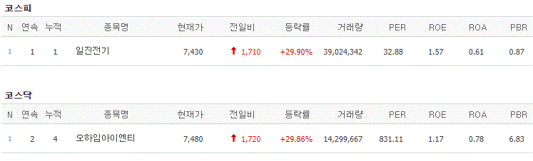 코스피에서는 일진전기가 상한가를 기록했고, 코스닥에서는 오하임아이엔티가 상한가를 기록했습니다.