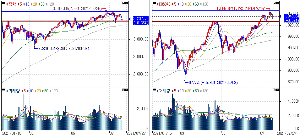 금일 코스피 지수는 -0.35% 하락한 3,232.70에 마감하였고, 코스닥 지수는 -0.59% 하락한 1,043.64에 마감하였습니다. 美증시가 빠지면서 아시아증시도 일제히 하락을 보이고 있습니다. 그동안 상승을 보였던 만큼 지지구간이 존재하지만 반등 구간에서의 수익을 극대화하면서 안정적으로 지켜보는 것이 좋습니다.