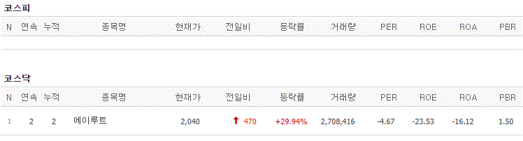 코스피에서는 상한가 종목이 없었고, 코스닥에서는 에이루트가 상한가를 기록했습니다.