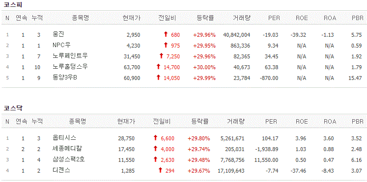 코스피에서는 웅진, NPC우, 노루페인트우, 노루홀딩스우, 동양3우B가 상한가를 기록했고, 코스닥에서는 옵티시스, 세종메디칼, 삼성스팩2호, 디젠스가 상한가를 기록했습니다.