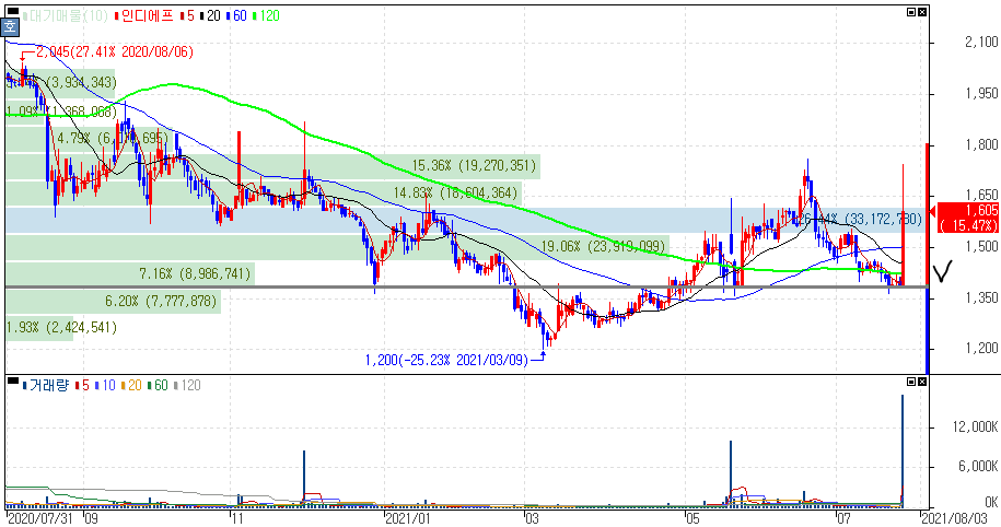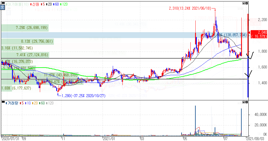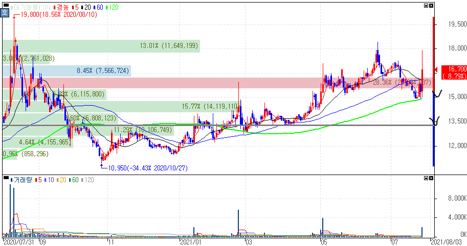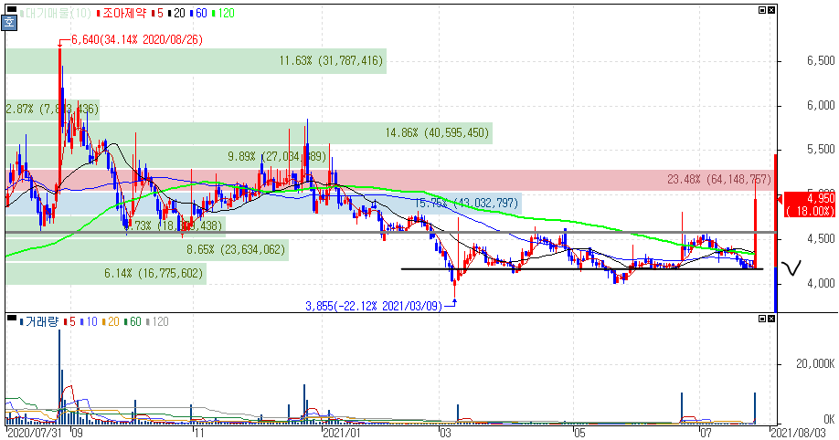 과거 진통제 및 빈혈약 등의 제품을 북한에 지원한 경험이 있어 의료협력 관련주로 불리는 종목인데 이번과 같은 남북 관계 개선에는 코로나 펜더믹으로 인한 식량난이나 의약품 부족을 겪는 북한이 남측의 손을 잡으려는 의도로도 보여진다는 시각으로 부각을 받았습니다.
