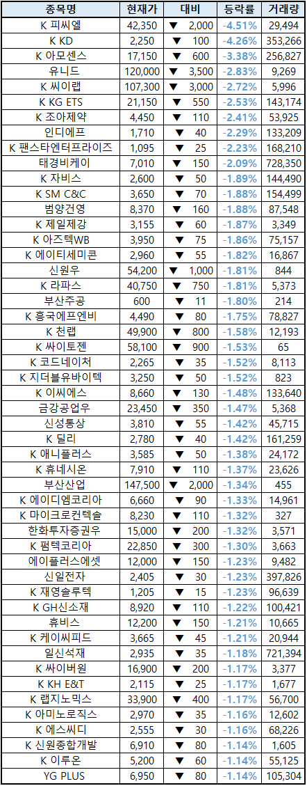 (종목명 앞에 'K'는 코스닥 종목을 의미합니다.)