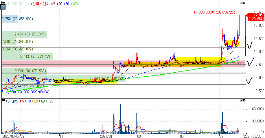 화이자, 코로나19 경구용 치료제 임상 착수 소식 및 코로나19 백신 특허 심사기간 단축 기대감 등에 코로나19 관련주 상승 속 상한가를 기록한 한국비엔씨 주가 입니다.