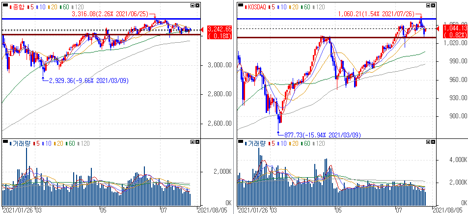금일 코스피 지수는 +0.18% 상승한 3,242.65에 마감하였고, 코스닥 지수는 +0.82% 상승한 1,043.73에 마감하였습니다. 얼마 전 이야기 드린대로 여전히 박스권 흐름이 지속되고 있습니다. 코로나 4차 대유행 속에서도 휴가철 시즌인 만큼 거래량도 크게 줄어든 상황이라 수급이 활발한 종목이 슈팅 찬스를 빨리 끌어올 수 있다는 것을 기억하세요.