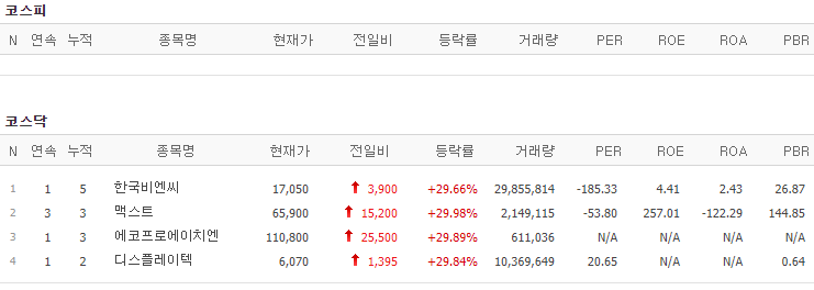 코스피에서는 상한가 종목이 없었고, 코스닥에서는 한국비엔씨, 맥스트, 에코프로에이치엔, 디스플레이텍이 상한가를 기록했습니다.